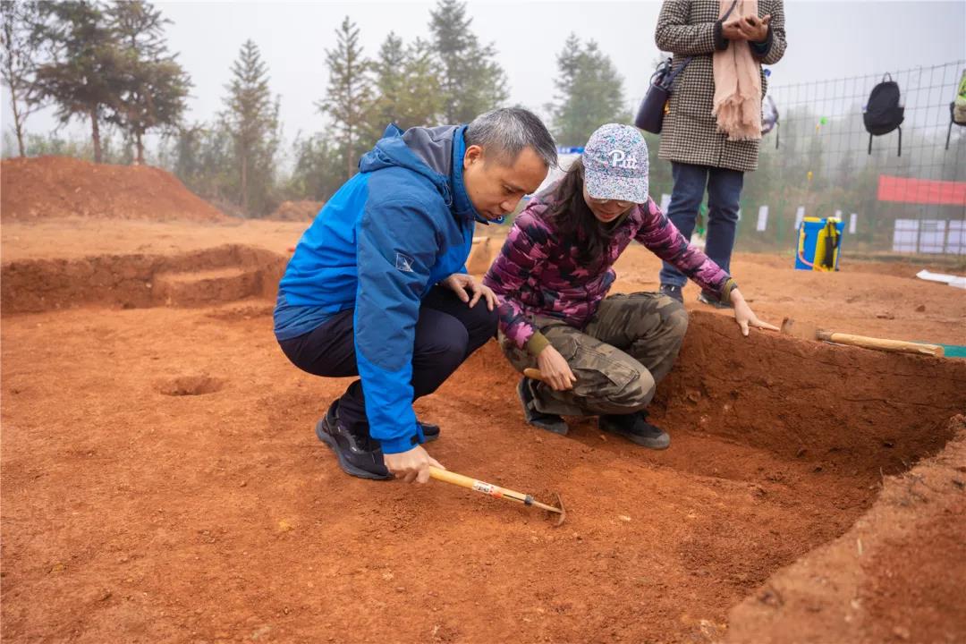 葛威和刘翀介绍了马道坪遗址历年发掘概况,并对此次实习的发掘进展进行了汇报。几位老师还拿起刮锄和手铲,饶有兴趣地在探方中体验刮面工作,了解田野考古发掘的工作流程。
