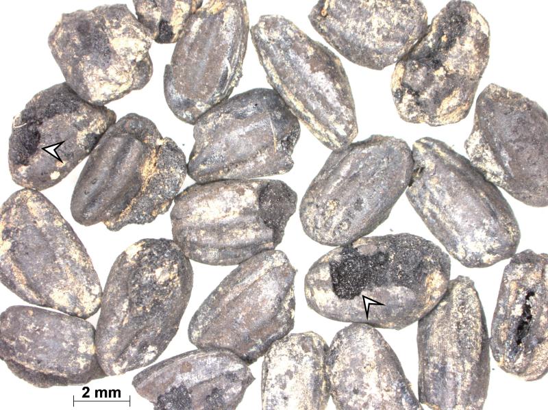 根据程侃声的划分,粳稻的粒型较为短圆,而籼稻粒型则较为细长,以长宽比来区分,这个界限大约为2.5。为了考察城村汉城北城门遗址发现水稻的性质,我们选取了形态保存较完好的19粒炭化稻,分别对其长宽进行了测量。结果显示,这些炭化稻的长度范围为4.32mm~5.45mm,平均值为5.00mm;宽度范围为2.28mm~3.11mm,平均值为2.78mm;长宽比的范围为1.55~2.14,平均值为1.80。这些炭化稻米的长宽比数据均落在小于2.5的范围。据此,我们可以推断城村汉城出土的水稻为粳稻。